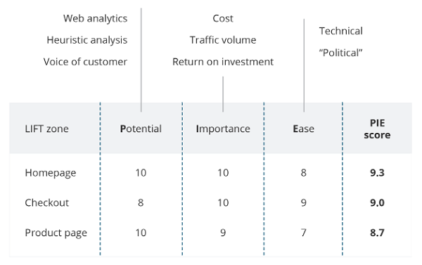 By quantifying each of your potential opportunities, you can create a test priority list. Using PIE Framework within a table, you can turn data inputs into an objective number ranking, highlighting your potential ‘quick wins’.