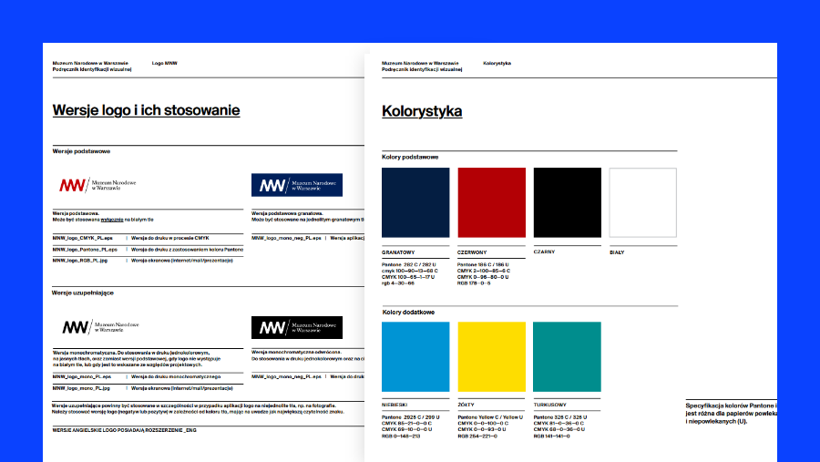 A national museum, in any country, is a cultural institution. In that, it needs a set branding regime, just like any household brand. As you will see, (Poland’s) National Museum Warsaw demonstrates variations of its logo while also showing the exact colours used, complete with colour codes.